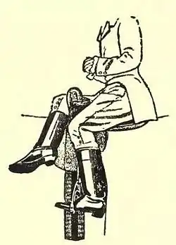A horse to be ridden by a woman must have been trained to stand absolutely quiet to be mounted, without the need of any second assistant.The rider stands at the left of the animal, facing forward. The right hand, resting on the second pommel of the saddle, holds the reins at the correct length for