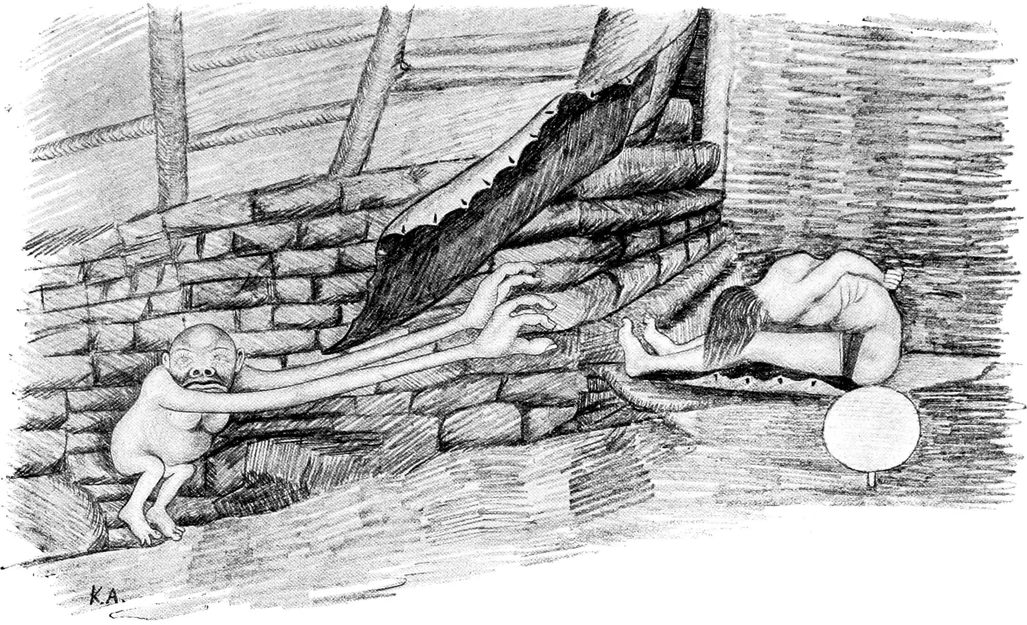 It is said that Ángángŭjuk’s father was very strong. They had no other neighbours, but lived there three of them all alone. One day when the mother was going to scrape meat from a skin, she let the child play at kayak outside in the passage, near the entrance. And now and again she called to him: “Ángángŭjuk!” And the child would answer from outside.
