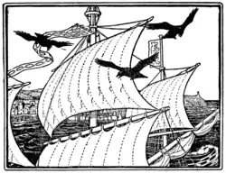 As they were nearing land John was sitting in the prow, and the Princess was reclining on a couch on deck, and three black ravens were flying about the mast of the vessel. Now John, being the son of a huntsman, knew the language of birds; and he listened to what they said, and this was it: