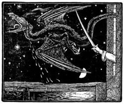 On the night of the wedding John the True took his place with drawn sword before the bridal chamber, and watched and watched and watched. Towards midnight he heard a rustling in the bridal chamber and, rushing in, saw a winged dragon coming through the window towards the King and Princess. He dashed towards it and wounded it with his sword, so that it flew out of the window, dropping blood on the way.