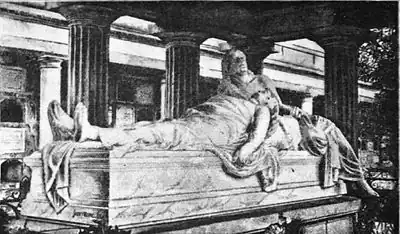 He then went on to relate the tragic and heart-rending incident of the death of the gallant forty-eight students, boys from fourteen to twenty, who had their swords wrested from their hands and died nobly in defense of their country. We listened to the old man's reminiscences as we passed the tombs of Zaragoza, Miramon, Mejia, and others; but welcomed the timely silence which fell on the party as we reached the tomb of Mexico's greatest statesman, patriot, and soldier, her Indian president, Benito Juarez. Here he lies, stretched out in majestic, marble dignity; so life-like, so realistic, as to cause a sudden thrill of awe in the beholder. It was a touching inspiration of Manuel Islas when he chiseled this sublime effigy, with the mourning figure of La Patria bending over it. Summer and winter this noble tomb is fragrant with floral offerings most gorgeous and beautiful, laid there by his grateful countrymen.