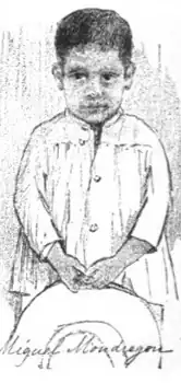 These poor women are often the mothers of such beauties as would arouse envy in the breasts of many aristocratic parents. Miguel Mondregon, whose picture is here given, was one of these children. His mother was a cook. We met him in the street in Tacubaya on the opening of the feast of Candlemas, and when I asked his name, he gave it, taking off his hat, as seen in portrait, which is an excellent likeness of him, and saying: "El criado de V." His style of dress is typical of his class. No urchin was ever happier than he when paid his real y medio (18 cents) to stand, hat in hand, while being sketched.