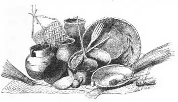The metate is cut from a porous, volcanic rock, and is about eighteen inches long by a foot in width and eight inches in thickness. The upper surface, which is generally a little concave, is roughened with indentures; upon this the article is placed and beaten with another stone called a mano, resembling a rolling-pin. Almost every article of food is passed between these stones—meat, vegetables, corn, coffee, spices, chocolate—even the salt, after being washed and sun-dried, is crushed upon it. Such a luxury as "table salt" was not to be had. Previous to use these stones are hardened by being placed in the fire. The rough points become as firm as steel, and one metate will last through a generation.
