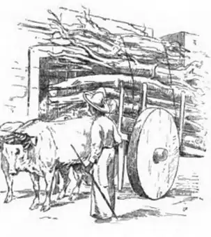 Promptly at the hour indicated, I was before the barred window, when I heard the awful screech, thump, bump, and rumble of the lumbering carretas. About a dozen in a line, they advanced slowly—their great old wooden wheels wabbling from side to side—drawn by oxen with rawhide trappings; their sturdy drivers sandal-footed and clothed in cotton cloth, with an iron-tipped goad in hand, punching and pushing the beasts at every step. Here was the wood—the entire tree, roots and all—ghosts of the forest hauled twenty-five miles, rolling down the street on an antiquated vehicle. In response to Pancho's hand-clap, the manager of the caravan demanded fifteen dollars a load, the dollars being the only part of the transaction that belonged to our age. But the wood was duly bought.