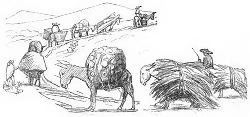They passed in a never-ending procession, bearing every imaginable commodity. I soon noticed that if the leader or "bell-wether" of the gang stopped, the rest did the same. If goaded to desperation by the merciless driver, the only resistance they offered was to quietly but doggedly lie down.