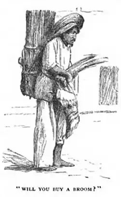 These brooms were of two varieties; one had handles[2] as knotty and unwieldy as the thorny mesquite while the other was still more primitive in design, and looked like old field Virginia sedge grass tied up in bundles. They were retailed by men who carried them through the streets on their backs.