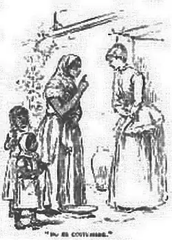 The mother approached me with an expression of deep concern and seriousness in her eyes, and with her forefinger raised in gentle admonition. Looking me earnestly in the face, she began moving her finger slowly from side to side directly before my eyes, saying: "Oiga, Señorita, sepa V. que en esta tierra, cuando nosotros los Mexicanos "(referring of course to her own class)" tenemos el catarro" (emphasizing the last word on G sharp), "nunca nos lavamos las caras" ("Listen to me, my good lady, in this country, when we have the catarrh (meaning a bad cold), we never put water on our faces").