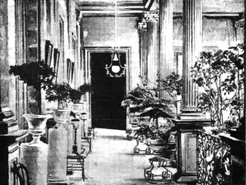 In the rear zaguan, a carriage is ever ready for the drive, while immediately behind this is an exquisite fairy-like grotto, with its fountain, creeping tropical vines and gorgeous flowers, distinctly visible from the sidewalk through the open doors. On one side are various baths, and still beyond, sewing rooms; while on the other are the numerous servants' rooms, all neat and well kept. Beyond these is the vast laundry, then the stables containing stalls for many horses, all sleek and shiny, with vehicles of various kinds, the premises extending until halted by the rear street.