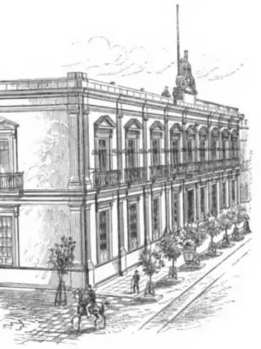 One gets strong ideas of imperialism in the decorations and furnishings of the municipal buildings and halls of congress. A city of twelve or fifteen thousand inhabitants has the mayor's ofifice fitted up as if that functionary were a representative of royalty. The legislative halls have an appearance of regal magnificence with their immense, lofty apartments, gayly frescoed and lined with portraits of the governors of the State; mirrors, chandeliers, and carpets of richest texture; and the dais with its canopied chair for the executive. For me, all this splendor, while it suggested the influence of the viceroys, found a suitable solution in the national love of bright colors and display.