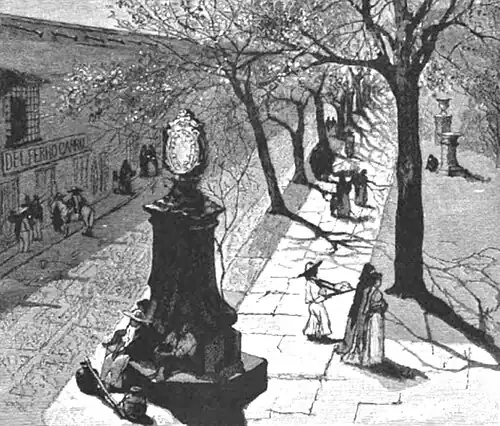 We visited many others, and always with an increasing desire to investigate further these remnants of the past. Among them were San Juan de Dios, La Merced, and San Diego. Special mention belongs to the last named. The convent of San Diego stands at the opening of the San Pedro Park. Attached to it is the sanctuary of Guadalupe, erected in 1708, a beautiful specimen of Doric architecture, adorned with columns, entablatures, and shields. This consecrated building served as a retreat for the bishop and clergy. The convent was founded by the will of a citizen of Valladolid, who in 1747 left $21,000 for that purpose, with the condition that the sanctuary be annexed to it. Accordingly the building was erected and the old sanctuary enlarged. Many years later the magnificent altar was constructed which now adorns the church. The tall cypresses which screen the entrance were planted in 1807. They no longer shelter the devotees nor the monks pacing up and down in pious meditation; for the convent of San Diego, like so many others, has been secularized, and families and individuals enjoy the rare privilege of dwelling in these noble tenements with their frescoed walls and deep recesses.