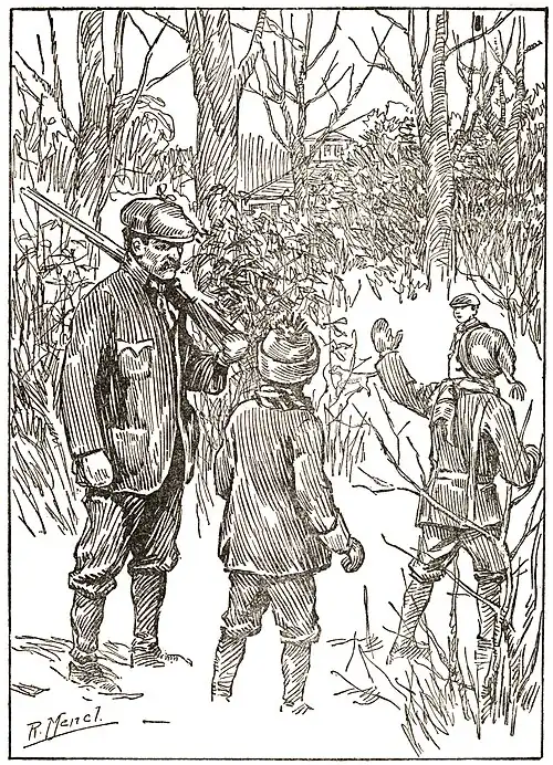 Mr. Jessup stared in surprise at the three lads, but before he could ask them the reason for their strange remarks there burst out from the bushes a fine hunting dog, who ran straight for the man, wagging his tail in delight.