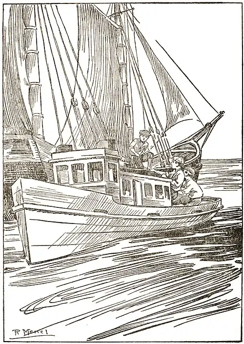 To this his chums agreed, and soon the wheel was tied fast, or "lashed" to use the proper sea term. Then the boys pulled on the rope attached to the motor boat, and brought the Skip alongside. They could easily get on her raised cabin deck from the schooner rail, for the larger vessel was not very high in the water.