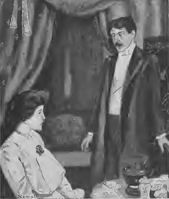 I rose as the first gray of dawn touched my window and groped about for the matches. As I did so, something slipped off my table to the floor, and, upon striking a light, I found it was a dinner-card, preserved as a memento of a recent festivity in town. It was a ridiculous affair, designed by the youngest daughter of the hostess, and represented an anatomically impossible gentleman in the act of bounding nimbly into something which resembled an ill-constructed bird’s nest. Below, in gilt paint, were my name and these lines: