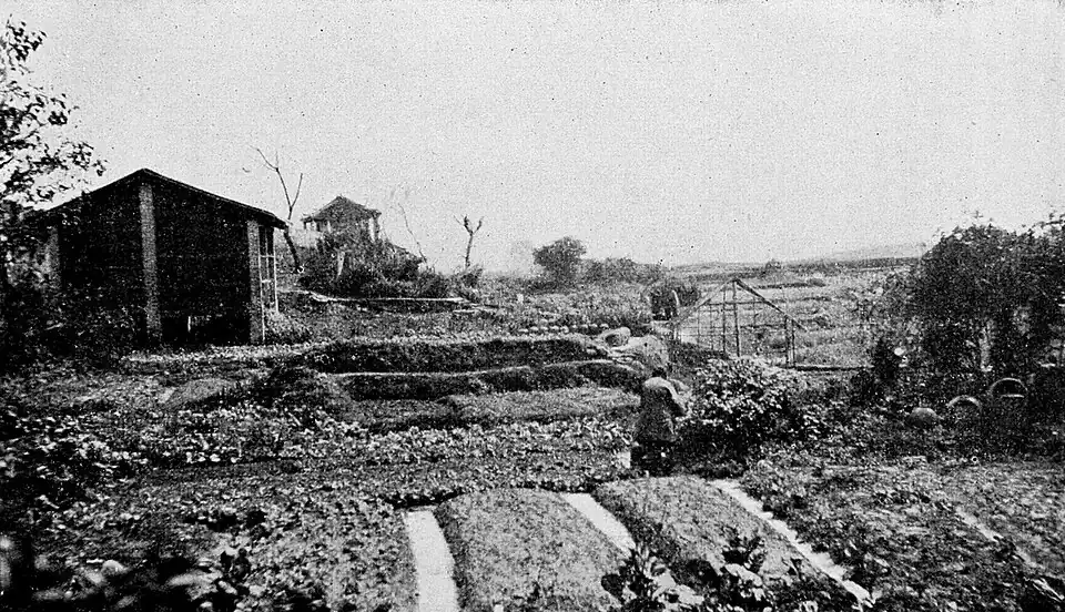 About five hours journey westward in this delta plain, where the fields lie six to ten feet above the present water stage, we reached the mulberry district. Here the plants are cultivated in rows about four feet apart, having the habit of small shrubs rather than of trees, and so much resembling cotton that our first impression was that we were in an extensive cotton district. On the lower lying areas, surrounded by dikes, some fields were laid out in the manner of the old Italian or English water meadows, with a shallow irrigation furrow along the crest of the bed and much deeper drainage ditches along the division line between them. Mulberries were occupying the ground before the freshly cut trenches we saw were dug, and all the surface between the rows had been evenly overlaid with the fresh earth removed with the spade, the soil lying in blocks essentially unbroken. In Fig. 43 may be seen the mulberry crop on a similarly treated surface, between Canton and Samshui, with the earth removed from the trenches laid evenly over the entire surface between and around the plants, as it came from the spade.