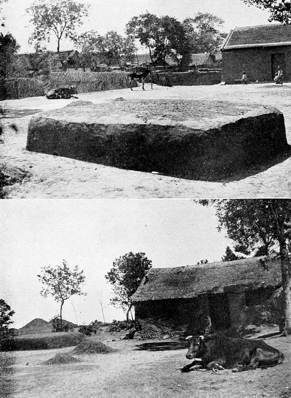 Fig. 137.—Two large peanut cakes and a paper demijohn for containing the oil, outside the village mill, Shantung, China.