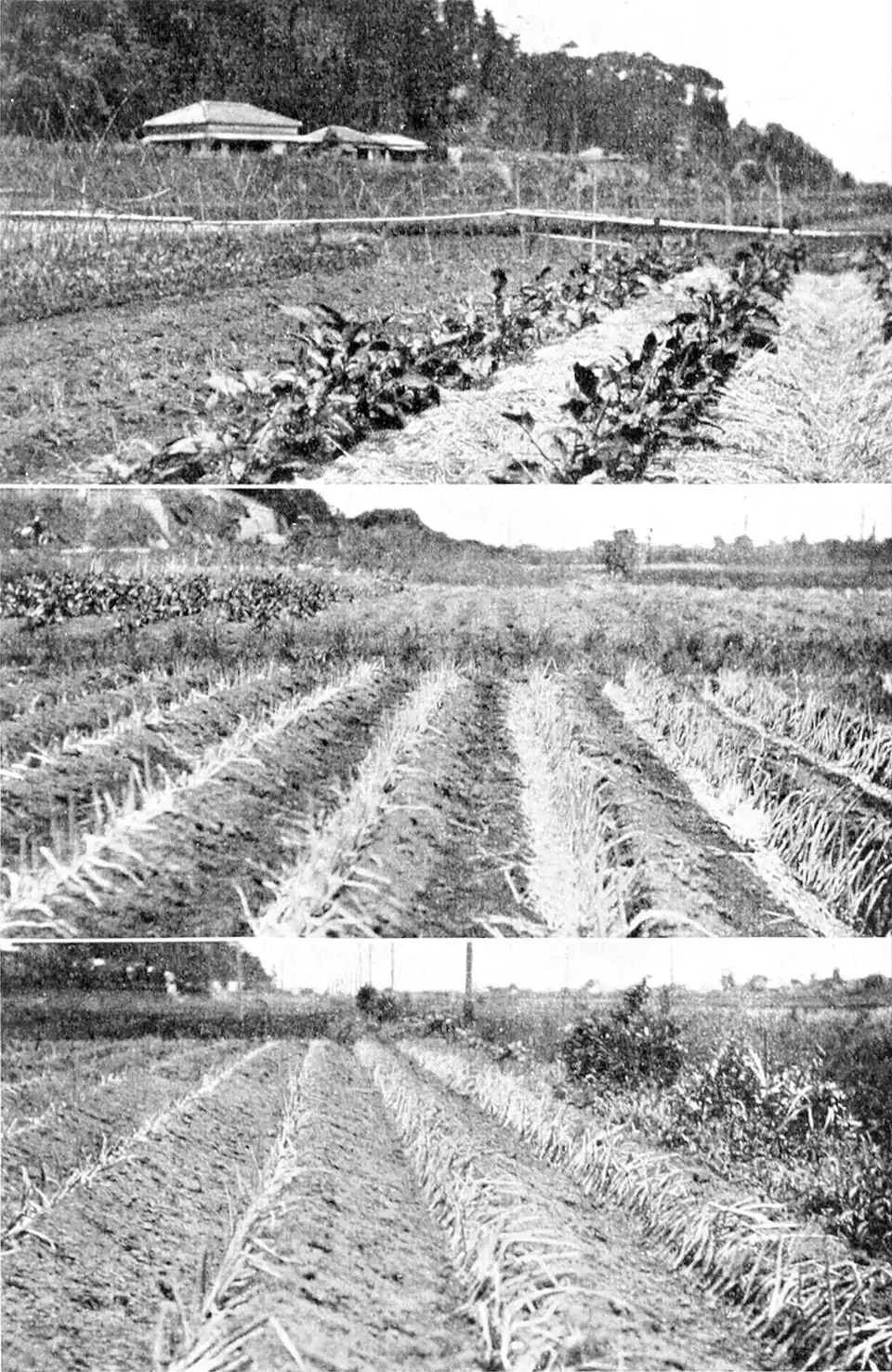 Reference has been made to the extensive use of straw in the cultural methods of the Japanese. This is notably the case in their truck garden work, and two phases of this are shown in Fig. 245. In the lower section of the illustration the garden has been ridged and furrowed for transplanting, the sets have been laid and the roots covered with a little soil; then, in the middle section, showing the next step in the method, a layer of straw has been pressed firmly above the roots, and in the final step this would be covered with earth. Adopting this method the straw is so placed that (1) it acts as an effective mulch without in any way interfering with the capillary rise of water to the roots of the sets; (2) it gives deep, thorough aeration of the soil, at the same time allowing rains to penetrate quickly, drawing the air after it; (3) the ash ingredients carried in the straw are leached directly to the roots where they are needed; (4) and finally the straw and soil constitute a compost where the rapid decay liberates plant food gradually and in the place where it will be most readily available. The upper section of the illustration shows rows of eggplants very heavily mulched with coarse straw, the quantity being sufficient to act as a most effective mulch, to largely prevent the development of weeds and to serve during the rainy season as a very material fertilizer.