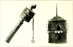 The smaller prayer-wheel, mounted on a long wooden handle and seen to the left of the Plate, is for hand use, and is kept in motion with very little effort by the help of the chain and weight. A hook and chain are also provided for the suspension of the wheel, which contains the usual formula, and has embossed on it the "eight glorious emblems" found in Buddha's footprints, viz. the golden fish, umbrella, conch-shell trumpet of victory, lucky diagram, victorious banner, vase, lotus, and wheel.
