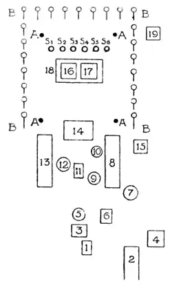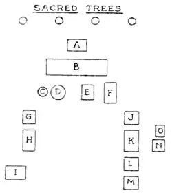 Before leaving the Umanglais and Lairemas I will describe two interesting ceremonies which I witnessed last summer. The young Raja came to me in a state of considerable anxiety, saying that he feared that some serious misfortune was about to happen to him, as he had received information that a certain stone, which he had erected at Santhong's lai-pham, had got out of the perpendicular and that an iron plate covering certain articles buried at Kanachauba's lai-pham had come to the surface. After some conversation, I gathered that the Raja wished me to accompany him to see the ceremonies. All arrangements had been made for our journey when news was brought that the hangjaba of Shuganu had died of cholera. Wāngpurel, the great god of the South, whose shrine is at Shuganu, and who is sometimes spoken of as the father, and sometimes as another form of Kanachauba, is said to reside in the hangjaba, who is the secular and religious head of the village. Opinions were divided as to the meaning of this sudden death; some said that the god had taken him, and that no further misfortune was to be expected; others feared further catastrophes. After a delay of some days we started and went first to Moirang and thence to the sacred grove of Santhong, which is situated in the middle of rolling grass lands some three miles from that village. Before describing the ceremony, I must tell you something of the history of the stones. Khagenba, who first reduced the Umanglai lore to writing, is credited with having erected the first of the six stones, as he was advised by the five gurus that this act would give him a long and prosperous reign, which he certainly had. Since his time five other Rajas have put up stones, burying a small gold cup beneath them. These stones are held to be closely connected with those who erect them, so that any accident happening to a living Raja's stone is thought to portend some evil happening to him personally. The stone placed by Surat Chandra was gnawed by a tiger, and shortly after he was deposed by his brothers; no wonder then that our Raja was anxious to do all he could to avert misfortune. The six stones (S1-6) stand just outside the grove on the southern side. Taking the stones from east to west, the names of those who put them up are: Surat Chandra, Kriti Chandra, Bhaggo Chandra, Khagenba, Nursingh, and Chura Chand (the present ruler). The accompanying plan shows how the properties and the actors were disposed:—