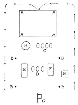 Before a cultivator cuts his crop he must place offerings of fruits and vegetables for Phau-woibi at each corner of his field, and the following ceremony should be performed. It is seldom carried out now, the cultivator contenting himself with calling his friends to help in the harvest and erecting a flag in the middle of the field. He has to provide food for all his helpers and, before they eat, one, the oldest present, is selected as phau-rungba, i.e. master of the rice, and he makes an offering of a portion of the eatables about to be consumed to Phau-woibi. The complete ceremony as given me by the pundits is as follows, referring to the plan:—