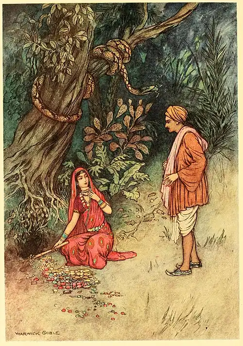 "Once on a time there lived a goldsmith who had a grown-up son. And this son had a wife who had the rare faculty of understanding the language of beasts; but neither her husband nor any one else knew that she had this uncommon gift. One night she was lying in bed beside her husband in their house, which was close to a river, when she heard a jackal howl out, 'There goes a carcase floating on the river; is there any one who will take off the diamond ring from the finger of the dead man and give me the corpse to eat?' The woman understood the jackal's language, got up from bed and went to the river-side. The husband, who was not asleep, followed his wife at some distance so as not to be observed by her. The woman went into the water, tugged the floating corpse towards the shore, and saw the diamond ring on the finger. Unable to loosen it with her hand, as the fingers of the dead body had swelled, she bit it off with her teeth, and put the dead body upon land. She then went to her bed, whither she had been preceded by her husband. The young goldsmith lay beside his wife almost petrified with fear, for he concluded after what he saw that his wife was not a human being but a Rakshasi. He spent the rest of the night in tossing in his bed, and early in the morning spoke to his father in the following manner: 'Father, the woman whom thou hast given me to wife is not a real woman but a Rakshasi. Last night as I was lying in bed with her, I heard outside the house, towards the river-side, a jackal set up a fearful howl. On this she, thinking that I was asleep, got up from bed, opened the door, and went out to the river-side. Surprised to see her go out alone at the dead hour of night, I suspected evil and followed her, but so that she could not see me. What did she do, do you think? O horror of horrors! She went into the stream, dragged towards the shore the dead body of a man which was floating by, and began to eat it! I saw this with mine own eyes. I then returned home while she was feasting upon the carcase, and jumped into bed. In a few minutes she also returned, bolted the door, and lay beside me. O my father, how can I live with a Rakshasi? She will certainly kill me and eat me up one night.' The old goldsmith was not a little shocked to hear this account. Both father and son agreed that the woman should be taken into the forest and there left to be devoured by wild beasts. Accordingly the young goldsmith spoke to his wife thus: 'My dear love, you had better not cook much this morning; only boil rice and burn a brinjal, for I must take you to-day to see your father and mother, who are dying to see you.' At the mention of her father's house she became full of joy, and finished the cooking in no time. The husband and wife snatched a hasty breakfast and started on their journey. The way lay through a dense jungle, in which the goldsmith bethought himself of leaving his wife alone to be eaten up by wild beasts. But while they