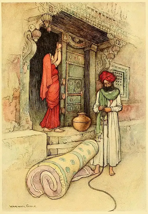 Sribatsa said to his wife, whose name was Chintamani, "Dearest, as the evil eye of Sani will be upon me at once, I had better go away from the house; for if I remain in the house with you, evil will befall you and me; but if I go away, it will overtake me only." Chintamani said, "That cannot be; wherever you go, I will go, your lot shall be my lot." The husband tried hard to persuade his wife to remain at home; but it was of no use. She would go with her husband. Sribatsa accordingly told his wife to make an opening in their mattress, and to stow away in it all the money and jewels they had. On the eve of leaving their house, Sribatsa invoked Lakshmi, who forthwith appeared. He then said to her, "Mother Lakshmi! as the evil eye of Sani is upon us, we are going away into exile; but do thou befriend us, and take care of our house and property." The goddess of good luck answered, "Do not fear; I'll befriend you; all will be right at last." They then set out on their journey. Sribatsa rolled up the mattress and put it on his head. They had not gone many miles when they saw a river before them. It was not fordable; but there was a canoe there with a man sitting in it. The travellers requested the ferryman to take them across. The ferryman said, "I can take only one at a time; but you are three—yourself, your wife, and the mattress." Sribatsa proposed that first his wife and the mattress should be taken across, and then he; but the ferryman would not hear of it. "Only one at a time," repeated he; "first let me take across the mattress." When the canoe with the mattress was in the middle of the stream, a fierce gale arose, and carried away the mattress, the canoe, and the ferryman, no one knows whither. And it was strange the stream also disappeared, for the place, where they saw a few minutes since the rush of waters, had now become firm ground. Sribatsa then knew that this was nothing but the evil eye of Sani.