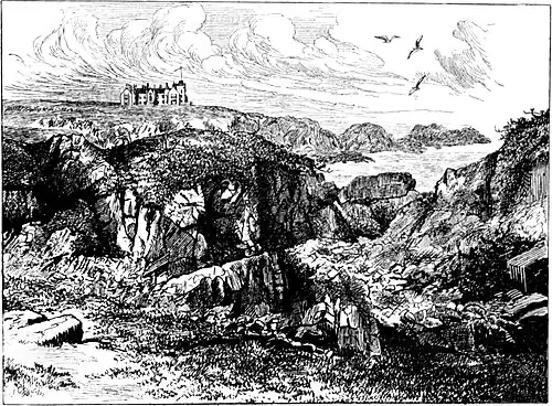 Boswell was also impressed with the position of this old house, set on the very verge of life. "The King of Denmark," he says, "is Lord Errol's nearest neighbour on the north-east." The Castle was built on the edge of the granite cliffs, in one spot not leaving even a foothold for the daring climber. A foolhardy fellow who had tried to get round lost his life in the attempt. I was greatly disappointed at finding that "the excellent old house" which Boswell describes, with its outside galleries on the first and second story, no longer remains. I had looked forward to standing in the very bow-window of the drawing-room fronting the sea where Johnson repeated Horace's Ode, Jam satis terris. In the new building, however, the bow-window has not been forgotten,—and there I looked out on the wild scene which met his view. I saw "the cut in the rock made by the influx of the sea," into which the rash climber had fallen as he tried to go round the Castle. Below me there were short slopes of grass ending in a precipice. So near was the edge that a child could have tossed a ball over it from the window. Red granite rocks in sharp and precipitous headlands ran out into the sea. A fishing-boat with brown sails was passing close by, while in the distance in a long line lay a fleet of herring-smacks. The sea-birds were hovering about and perching on the rocks, mingling their melancholy cries with the dashing of the waves. The dark waters were surging through the narrow chasms formed by rocky islets and the steep sides of the cliffs. For the storm-tost sailor it is a dreadful coast. On a wild night in winter not many years ago one of the maids, as she was letting down the blinds in the drawing-room, heard confused sounds which came, she thought, from the servants' hall beneath. The butler in another part of the house had caught them too. Yet when they reproached their fellow-servants with their noisiness they were told that it was not from them that the sounds had come. They thought no more