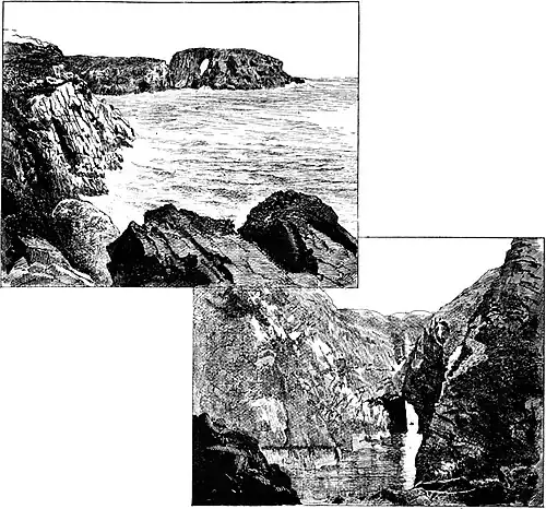 As the weather was calm they took a boat and rowed through the archway into the cauldron. "It was a place," writes Johnson, "which, though we could not think ourselves in danger, we could scarcely survey without some recoil of mind." lie thought that "it might have served as a shelter from storms to the little vessels used by the northern rovers." Sir Walter Scott, however, was told that this was impossible, for "in a high gale the waves rush in with incredible violence. An old fisher said he had seen them flying over the natural wall of the Bullers, which cannot be less than two hundred feet high.[36] In the Gentleman's Magazine for 1755 (p. 200), two strange pictures are given of this curious place, which must surely have been drawn in St. John's Gate, Clerkenwell, by an artist who had never seen it.