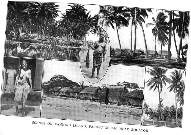 The white population of Fanning Island consists of some twenty persons, mostly employed at the cable station, and about two hundred natives recruited from the Gilbert Islands for the cocoanut plantations.