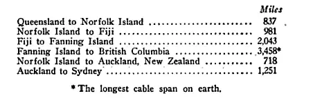 The laying of the Sydney-Auckland Cable in 1912 has further greatly enhanced the value of the service to and from Australia. This secures duplicated routes for all traffic given transit at Norfolk Island, and forms a great factor for avoidance of slow transit to both International and Intercolonial traffic. The route of the cable is as follows: