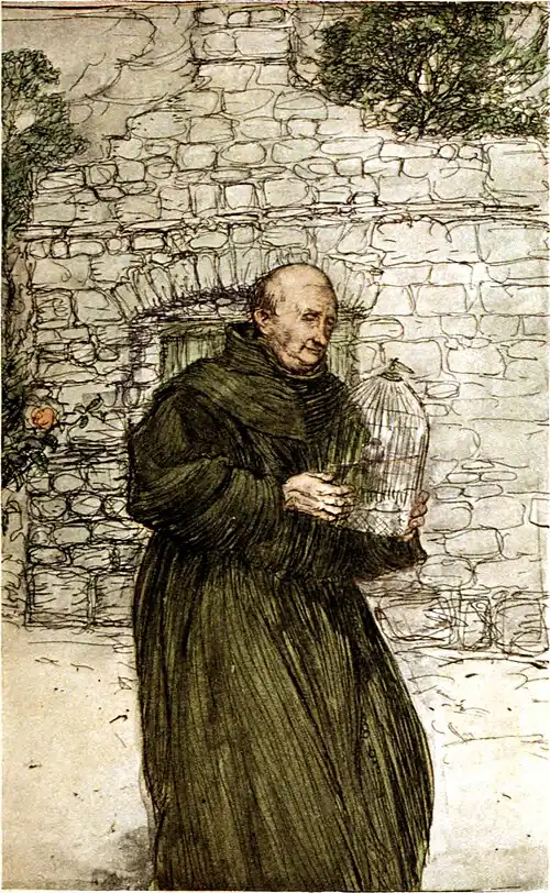 When a second fuchsia came fluttering down to his hand, Padre Alonzo uncrossed his sandals and rose. “Oh! oh! oh!” he cried, wagging his close-cropped head so vigorously that the very beads of his rosary tinkled together. “Thou art the naughtiest bird in, all of California! What if Padre Anzar finds thee despoiling his plant? He will put thee again where thou must fight to keep thy feathers–in the kitchen with the cats!”