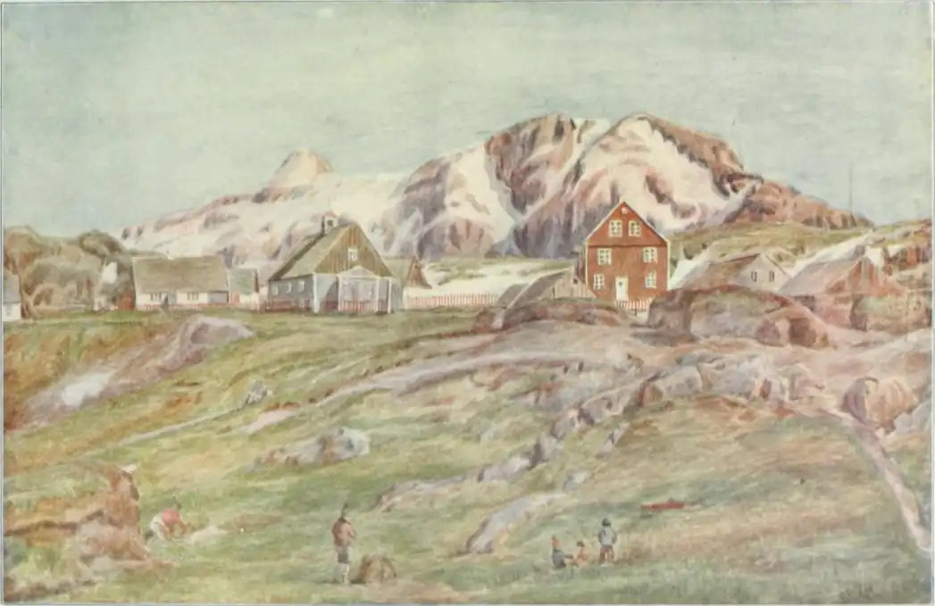 If the journey is commenced at Godthaab or Holstenborg there is still 100 kilometres from the coast to the inland-ice, and even from the highest coastal mountains one cannot as a rule see it. Wild, riven mountains form the landscape, and occasionally the sun is reflected in the shiny surface of a glacier, or shines on the snowdrift, which is so big that it does not melt in the short summer.