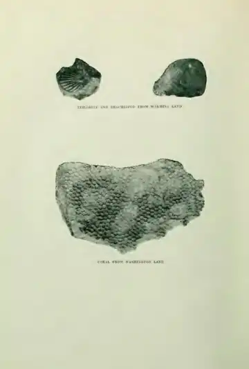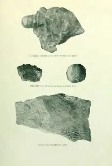 Wherever one lands under the steep mountains one finds stones full of fossils. These fossiliferous strata are found not only on Washington Land, but they also form a broad belt of plateaux right up to Peary Land. It therefore seems natural in considering these formations to take them as a whole. This chain of plateaux mountains, which have a height of upwards of 1,500 metres, forms the border of the inland-ice to the north. Only occasional narrow valleys cut in between the plateaux, and through these long, almost horizontal, glaciers stretch down until they reach the sea.