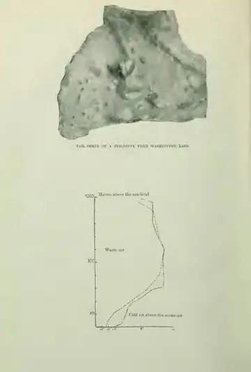 As already mentioned, the North Greenlandic series of strata ended in coarse sandstone, which during the Devonian Period was then folded up into the mountain chain. What subsequently happened is not known with certainty. Great stretches of North Greenland, and first and foremost the mountain chain, have during part of the Mesozoic Period been raised above the sea-level, and during this period the mountain chain became constantly lower; but no fossiliferous strata have been preserved, so one must fall back on hypotheses regarding the conditions. During the Tertiary Period there must certainly have been land with semitropical forests here, for remains of such are to be found on Grant Land, which lies right opposite.
