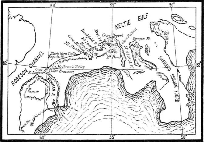 From the wind-swept look-out of our mountain we could see clear across to the country round Grant Land, looming far, far to the north amidst a sea of ice like blue banks of fog. Furthest away Inukitsoq recognized Cape Sheridan, the winter harbour of Nares in 1875-76, and later on Peary's quarters during no less than two Polar expeditions.