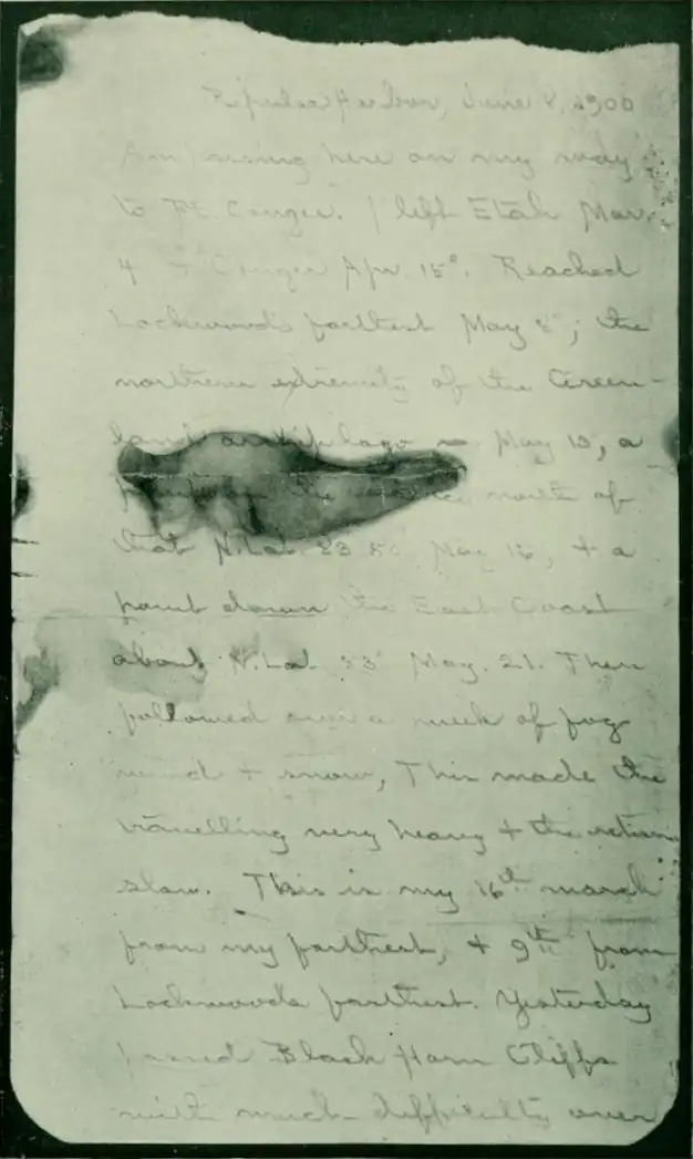 "Am passing here on my way to Ft. Conger. I left Etah March 4th and Conger April 15th. Reached Lockwood's farthest May 8th; the northern extremity of the Greenland archipelago on May 13th; a point on the sea-ice north of that N. Lat. 83° 50' May 16th; and a point down the east coast about North Lat. 83° May 21st. There followed over a week of fog, wind and snow, this made the travelling very heavy and the return slow. This is my 16th march from my farthest and 9th from Lockwood's farthest. Yesterday passed Black Horn Cliffs with much difficulty over loose ice. There is open water now off this point and a lane of open water this side of C. Brevoort extending clear across the channel. Have with me my man Matthew Henson, one Eskimo, 16 dogs and 2 sledges, all in fair condition.
