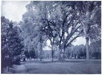 This meadow cemetery is nearly filled up, and it is an eloquent memorial of the past. First, at the western end, are the brown stones of the early settlers, moss grown and with inscriptions scarcely legible, then the eastern portion is being thickly filled with the marble stones of more modern days, so that the inhabitants of the burial ground outnumber the living in the elm embowered street.