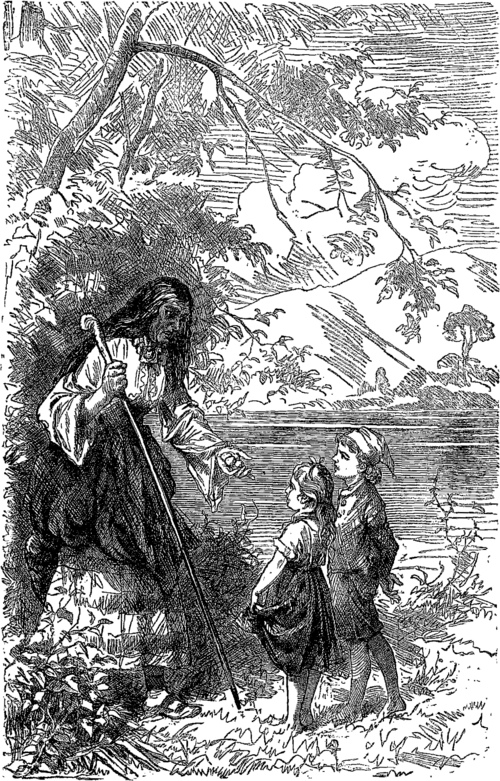 Close to where they stood grew a hazel-bush, covered with beautiful nuts. They soon gathered some, cracked them, and ate the fine young kernels, which were only just ripe. But there was another surprise and fright in store for them. Out of the thicket stepped a tall old woman, her face quite brown, and her hair of a deep shining black; the whites of her eyes glittered like a Moor’s; on her back she carried a bundle, and in her hand a knotted stick. She was a gypsy. The children did not at first understand what she said. She drew out of her pocket three large nuts, in which she told them were hidden the most beautiful and lovely things in the world, for they were wishing nuts. Ib looked at her, and as she spoke so kindly, he took courage, and asked her if she would give him the nuts; and the woman gave them to him, and then gathered some more from the bushes _-_p._100.png)