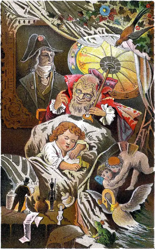“Hark ye! Mr. Luk-Oie,” said an old portrait which hung on the wall of Hjalmar’s bedroom. “Do you know me? I am Hjalmar’s great-grandfather. I thank you for telling the boy stories, but you must not confuse his ideas. The stars cannot be taken down from the sky and polished; they are spheres like our earth, which is a good thing for them.”