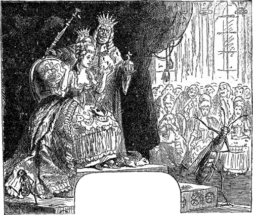 And now the jumpers are going to begin. The flea jumped so high that no one could see him, and then it was said that he had not jumped at all, which was scandalous and untrue. The grasshopper only jumped half as high as the flea, but he sprung right into the king’s face, and caused him to say—
