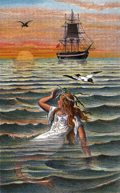 In the moonlight, when all on board were asleep, excepting the man at the helm, who was steering, she sat on the deck, gazing down through the clear water. She thought she could distinguish her father’s castle, and upon it her aged grandmother, with the silver crown on her head, looking through the rushing tide at the keel of the vessel. Then her sisters came up on the waves, and gazed at her mournfully, wringing their white hands. She beckoned to them, and smiled, and wanted to tell them how happy and well off she was; but the cabin-boy approached, and when her sisters dived down he thought it was only the foam of the sea which he saw.