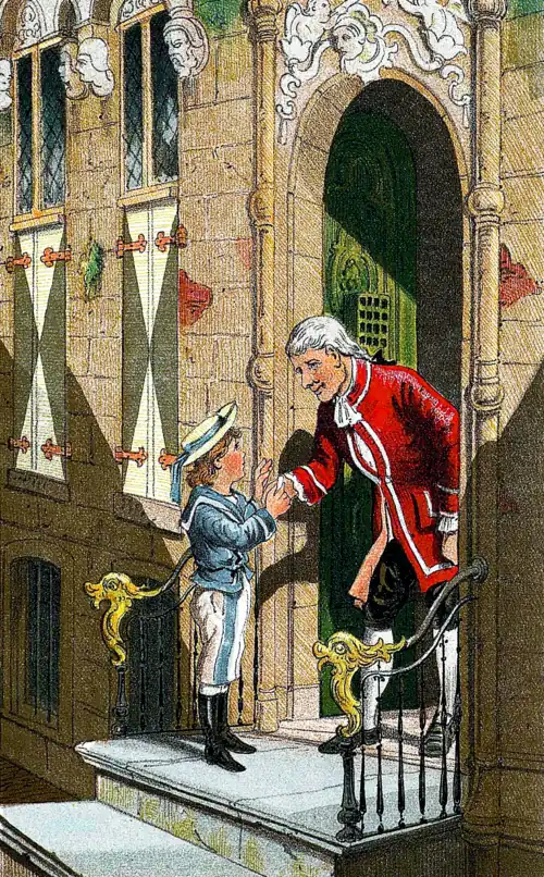 An old man lived in it, who wore knee-breeches, a coat with large brass buttons, and a wig, which any one could see was a real wig. Every morning an old man came to clean the rooms, and to wait upon him, otherwise the old man in the knee-breeches would have been quite alone in the house. Sometimes he came to one of the windows and looked out; then the little boy nodded to him, and the old man nodded back again, till they became acquainted, and were friends, although they had never spoken to each other; but that was of no consequence.