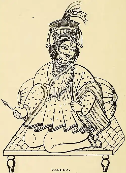 Varuna is represented in pictures as a white man sitting upon a fabulous marine monster called a makara. This animal has the head and front legs of an antelope, and the body and tail of a fish. In his right hand he carries a noose. He is occasionally worshipped in seasons of drought, and by fishermen as they cast their nets, but now-a-days no images of him are made.