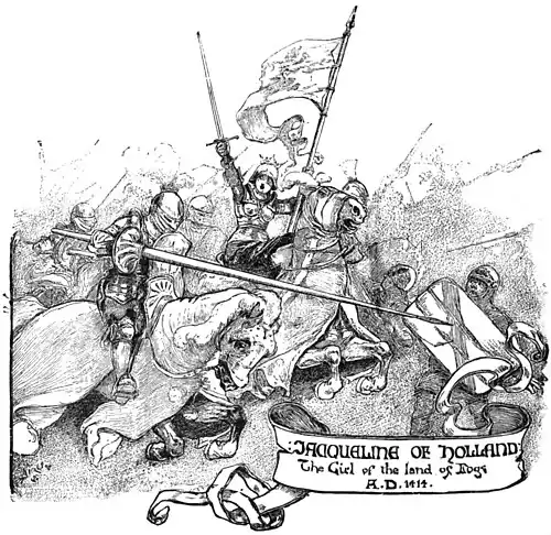 And it was a rash and foolish act. But we must remember that those were days when such feats were esteemed as brave and valorous. For the Princess Jaqueline of Holland was reared in the school of so-called chivalry and romance, which in her time was fast approaching its end. She was, indeed, as one historian declares, the last heroine of knighthood. Her very titles suggest the days of chivalry. She was Daughter of Holland, Countess of Ponthieu, Duchess of Berry, Lady of Crevecoeur, of Montague and Arloeux. Brought up in the midst of tilts and tournaments, of banquets and feasting, and all the lavish display of the rich Bavarian court, she was, as we learn from her chroniclers, the leader of adoring knights and vassals, the idol of her parents, the ruler of her soft-hearted boy husband, an expert falconer, a daring horsewoman, and a fearless descendant of those woman warriors of her race, Margaret the Empress, and Philippa the Queen, and of a house that traced its descent through the warlike Hohenstaufens back to Charlemagne himself.
