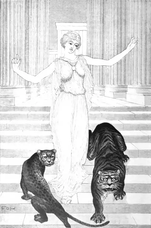 She stood erect, robed in a flowing, crimson, embroidered, with head slightly thrown back, and one hand and arm pointing stiffly outward and upward. The countenance was not merely Grecian—ancient Grecian, as distinct from modern—but it was so in a highly exaggerated and unlifelike degree. Was the woman, I asked myself, more lovely than ever mortal was before—or more hideous? She was the one, or the other, or both; but the riddle baffled me. The Lamia of Keats arose before me—that "shape of gorgeous hue, vermilion-spotted, golden, green and blue." A hardly-breathing surprise of eyes held me fixed as the image slowly took possession of my vision. Here, then, I muttered, was the Gorgon's head, whose hair was serpents and her eye a basilisk's; and as I so thought, I reflected, too, on the myth of how from the dripping blood of Medusa's head strange creatures sprang to life; and then, with a shuddering abhorrence, I remembered Huguenin's childish ravings about "monsters." I drew nearer, in order to analyse the impression almost of dread wrought upon me, and I quickly found—or thought I found—the key. It lay, surely, in the woman's eyes. They were the very eyes of the tiger: circular, green, large, with glittering yellow radii. I hurried from the room.