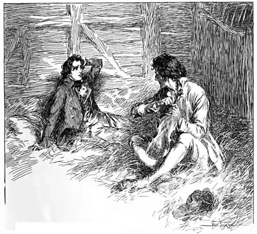 "Comrades on the straw—eh! What a bed for his Lordship! Misérables! They have no idea of the importance of rank, these benighted forest-folk. Yet give me the clean, yellow straw, smelling of the sunshine in the dark, and whispering of the fields, rather than your stuffy mountains of feathers."