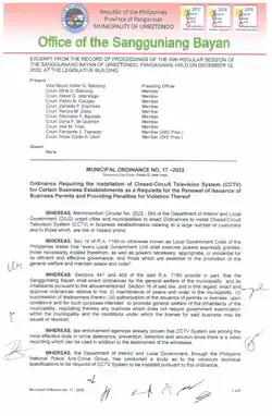 Ordinance Requiring the Installation of Closed-Circuit Television System (CCTV) for Certain Business Establishments as a Requisite for the Renewal of Issuance of Business Permits and Providing Penalties for Violation Thereof, 2022