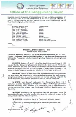 Ordinance Amending Section 1 (a) (5) of Municipal Ordinance No. 6 – 2021, Entitled “Ordinance Creating Various Positions in the Municipal Government of Urbiztondo, Pangasinan with Corresponding Salary Grade and Allocating Funds Therefor”, 2022
