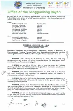 Ordinance Prohibiting the Compounding, Dispensing, Selling or Reselling of Pharmaceutical Products Through Retail Drug Outlets Not Licensed by the Food and Drug Administration (FDA) and Providing Penalties For Violation Thereof, 2022