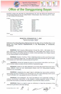 Ordinance Providing Regulatory Mechanisms for the Sale of Iron Fortified Rice in All Stores and Food Service Establishments in the Municipality of Urbiztondo, Pangasinan, 2022