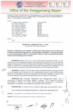 Ordinance Abolishing the Position of Municipal Administrator and Creating the Position of Executive Assistant III, Administrative Assistant V (Private Secretary I), and Administrative Officer II (Information Officer I) with Corresponding Salary Grade and Allocating Funds Therefor, 2022